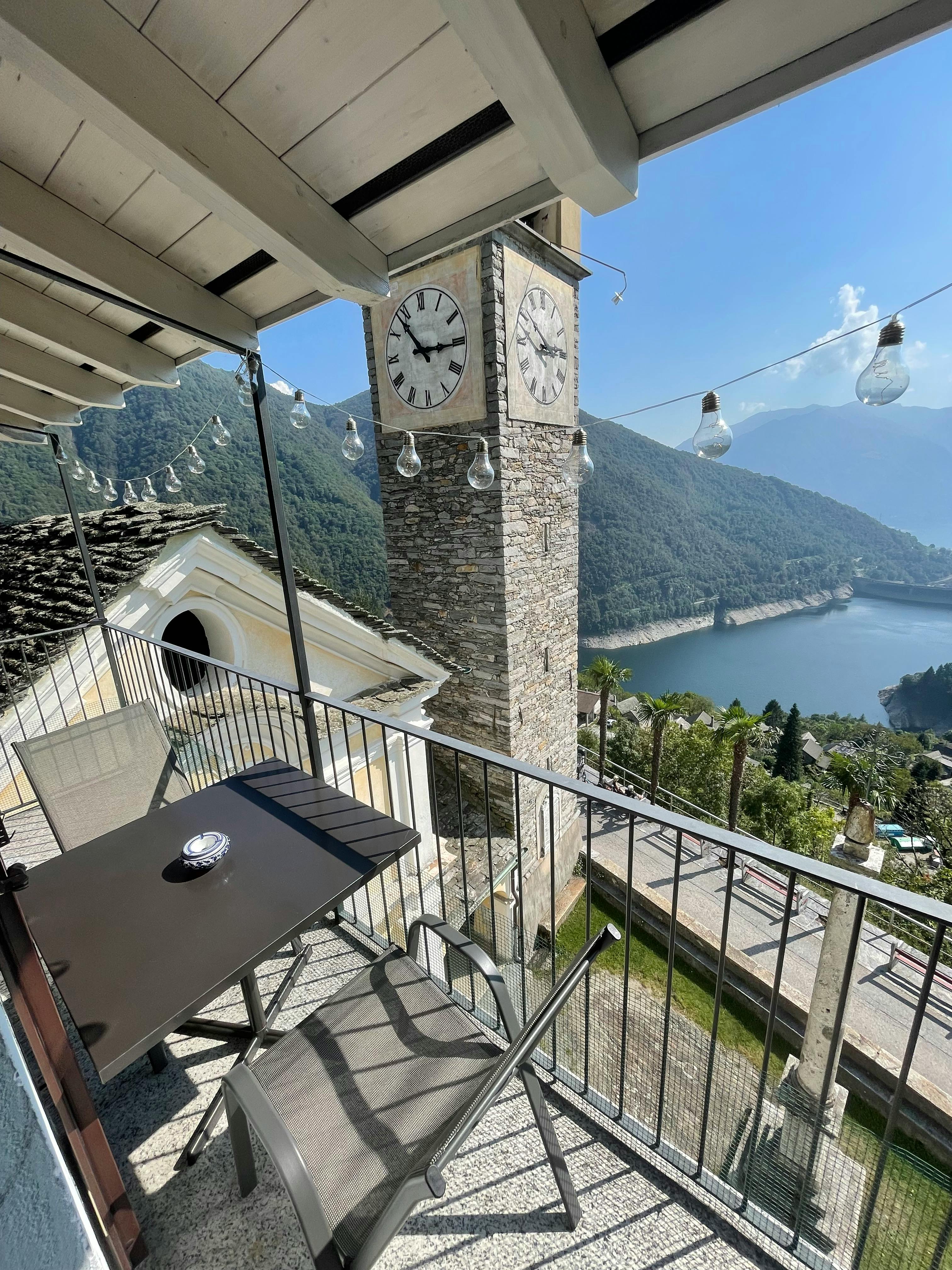 From the Cà Armonia 1 Loft-studio, you can admire both Lake Vogorno (also known as Lake Verzasca) and Lake Maggiore simultaneously, along with the famous Verzasca Dam from the James Bond film GoldenEye, the surrounding mountains, and the traditional church bell tower, right in front of the building.
