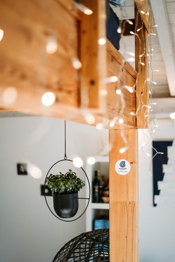 The space is bright and inviting, featuring an open kitchen and a wooden mezzanine with a double bed (two single mattresses 90 × 200 cm). On request, the sofa bed on the lower floor can be prepared as a third bed (90 × 200 cm) for an additional guest.
