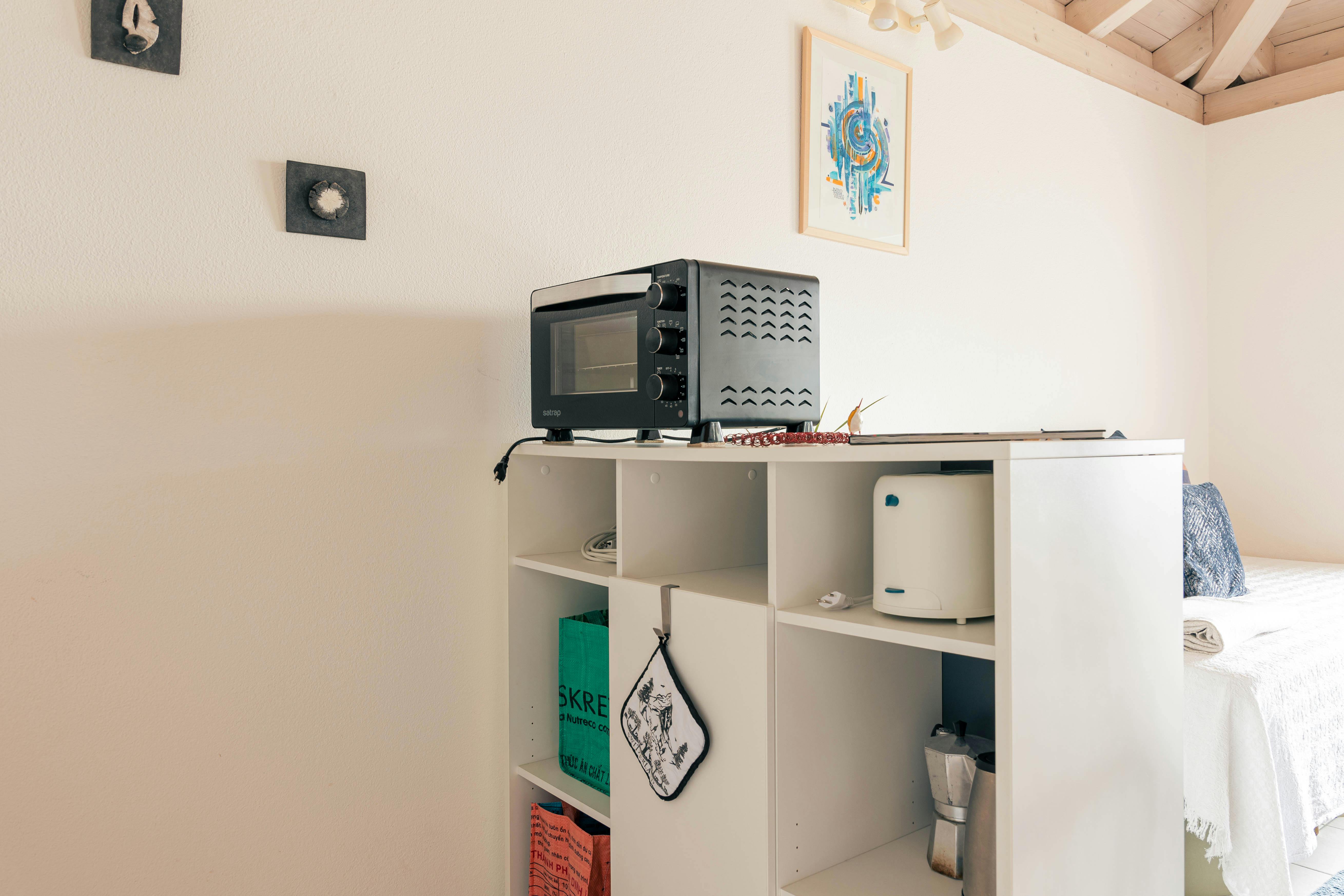 The fully equipped kitchen has everything you need for a comfortable stay. It includes a refrigerator with a small freezer, an electric stove, a small electric oven, a toaster, a kettle, a Delizio coffee machine (please bring your own Delizio capsules), and a Bialetti moka pot. Oil, vinegar, salt, and pepper are provided.