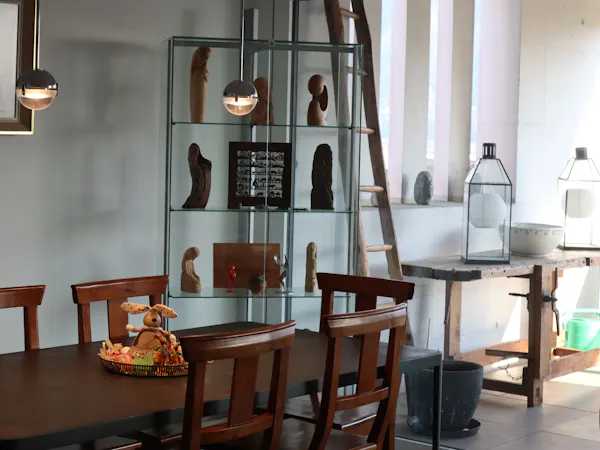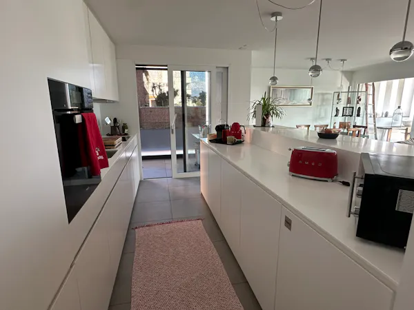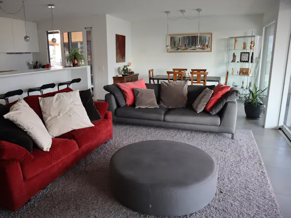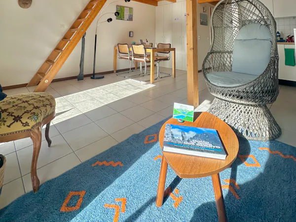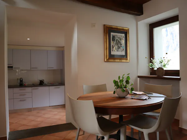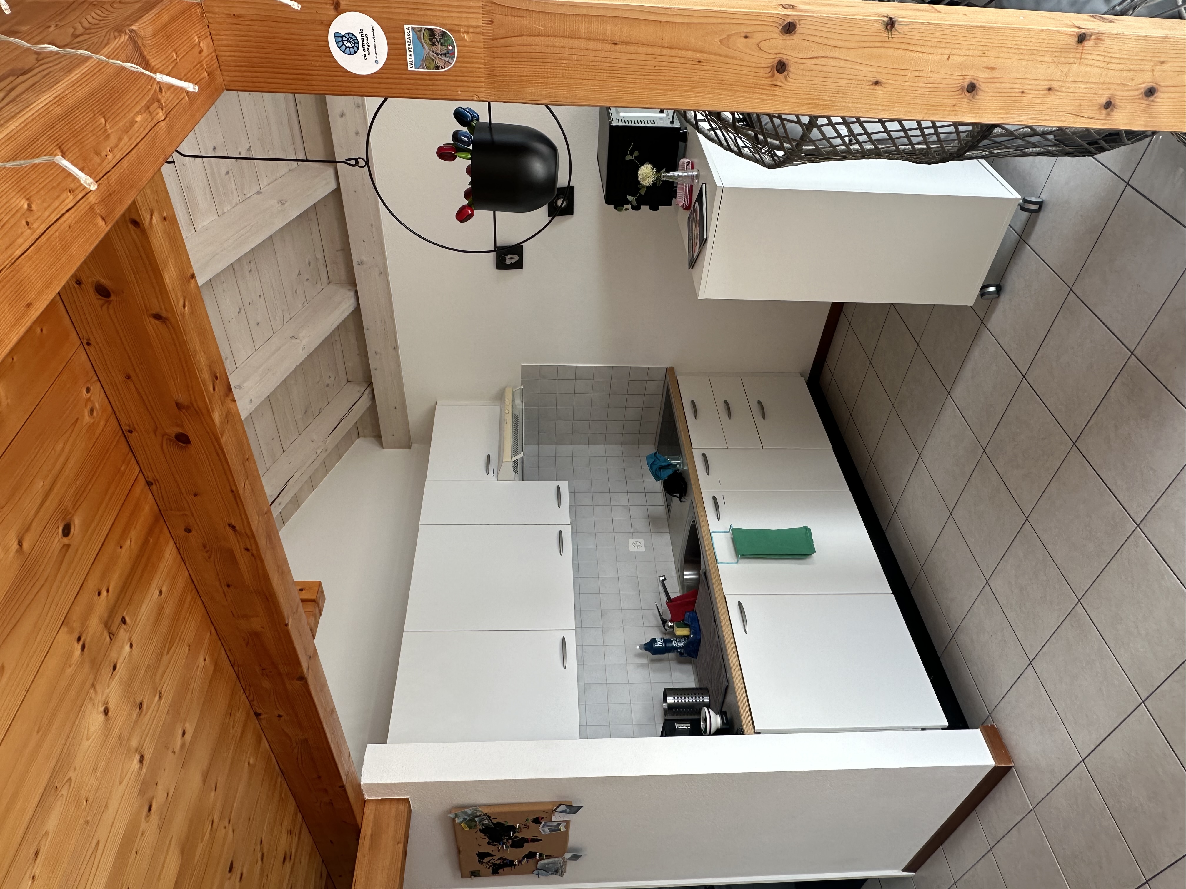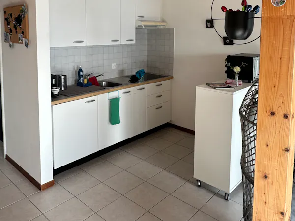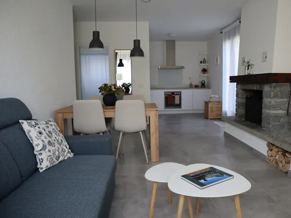 Beim Betreten der Wohnung gelangst du direkt in den Wohnbereich mit offener Küche, die vollständig ausgestattet ist mit Elektrobackofen, geräumigem Kühlschrank mit Gefrierfach, Wasserkocher und einer Delizio-Kaffeemaschine. Ausserdem gibt es einen funktionsfähigen Kamin (Holz gegen Aufpreis erhältlich) sowie einen Esstisch.