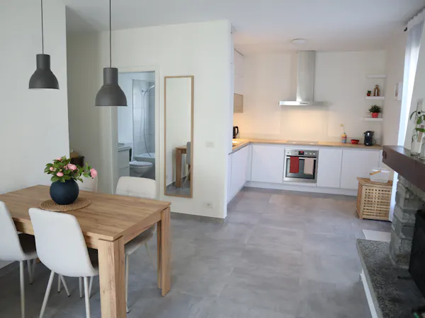 Die Unterkunft erstreckt sich über eine Ebene und empfängt die Gäste in einem eleganten, offenen Raum, der Küche, Essbereich und Wohnzimmer kombiniert. Die moderne, voll ausgestattete Küche öffnet sich zum Wohnbereich, in dem du entspannen, Filme schauen oder TV über HDMI anschliessen kannst. Auf Anfrage kann auch der Kamin genutzt werden.