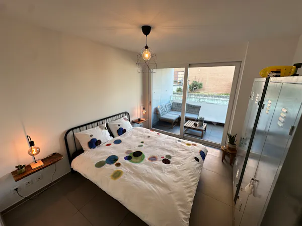 Der Raum ist hell und einladend und verfügt über eine offene Küche, die direkt mit dem Wohnzimmer verbunden ist. Ein separates Schlafzimmer verfügt über ein Design-Doppelbett von MDF Italia (160 × 200 cm). Für einen dritten Gast steht im selben Zimmer zudem ein modernes „Room in a Box“-Einzelbett aus Karton (90 × 200 cm) zur Verfügung.
