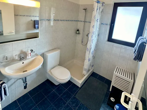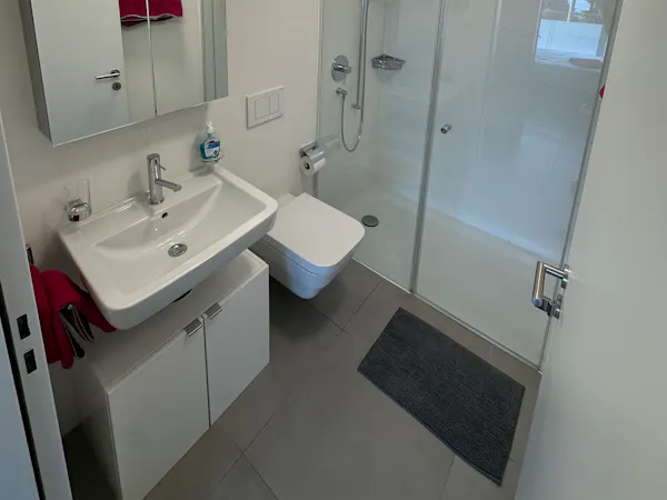 Das Badezimmer verfügt über Toilette, Lavabo und Badewanne. Handtücher sind Daniel Jenny & Co® OEKO-TEX Standard 100 zertifiziert und Swiss Made. Ein Föhn, Eco-Seife, Eco-Shampoo und Toilettenpapier sind ebenfalls vorhanden. Alle Haushaltsprodukte, inkl. Reinigungsmittel und Spülmittel, sind natürlich und umweltfreundlich, sodass du einen nachhaltigen Aufenthalt geniessen kannst.