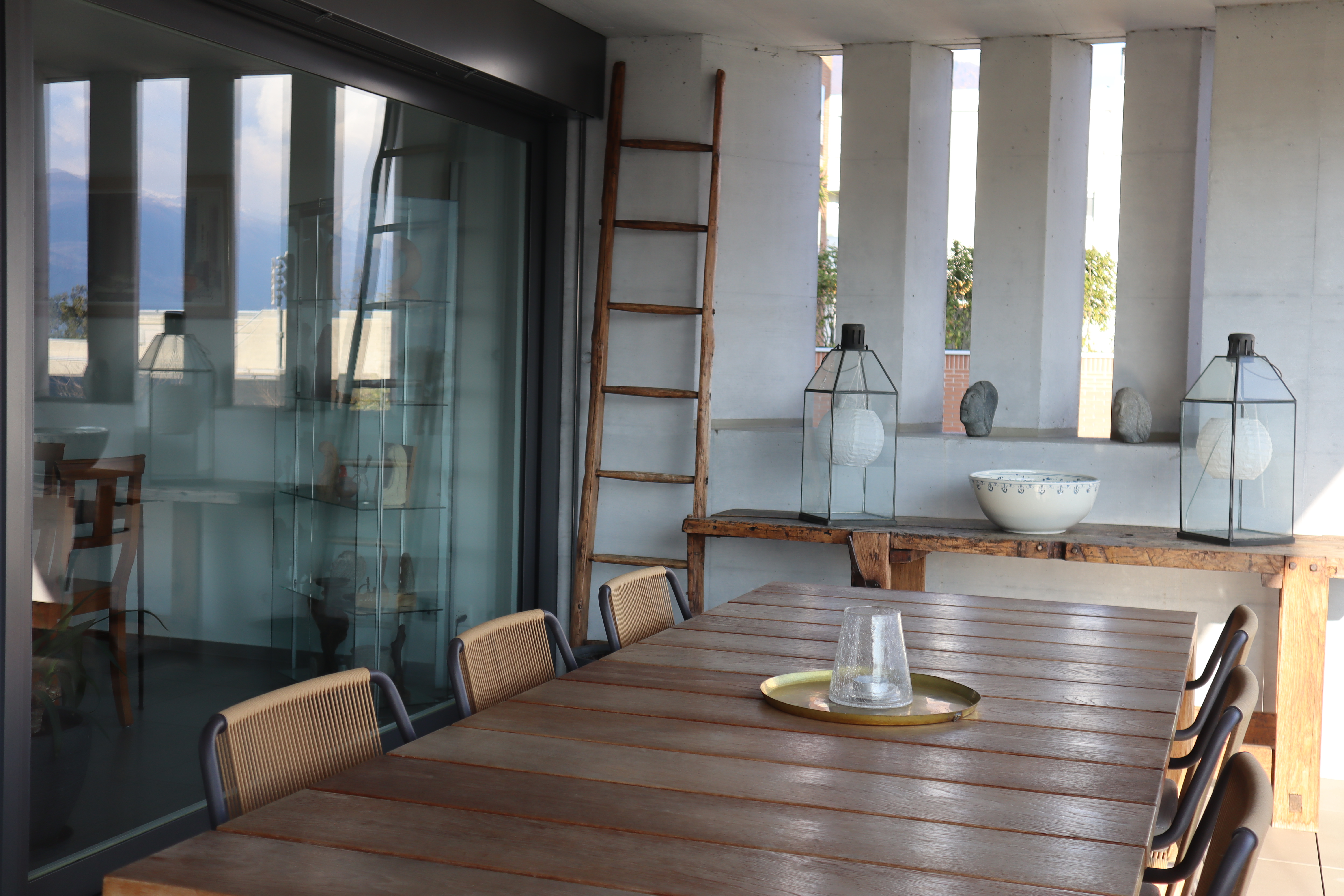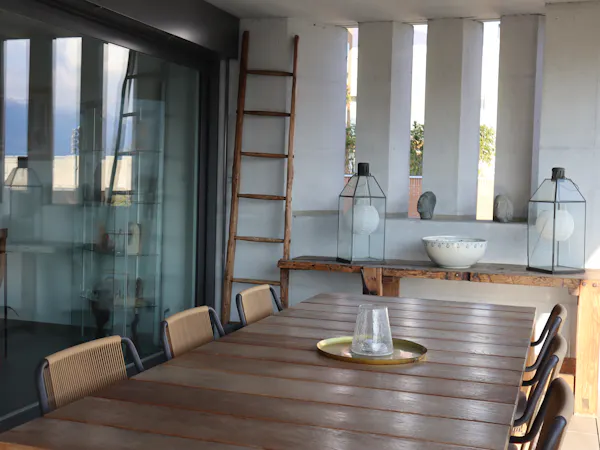 Die grossen Schiebetüren im Wohnzimmer führen zur Terrasse, ausgestattet mit Tisch und acht Stühlen – ideal für Mahlzeiten im Freien. Zwei Schlafzimmer öffnen sich direkt zur Terrasse und schaffen so eine harmonische Verbindung zwischen Innen- und Aussenbereich.