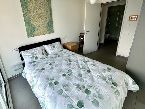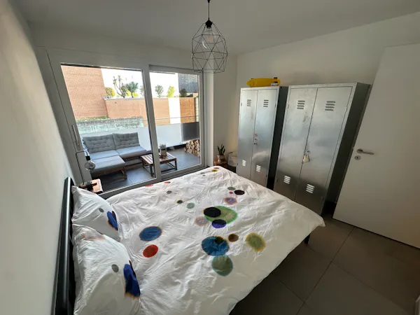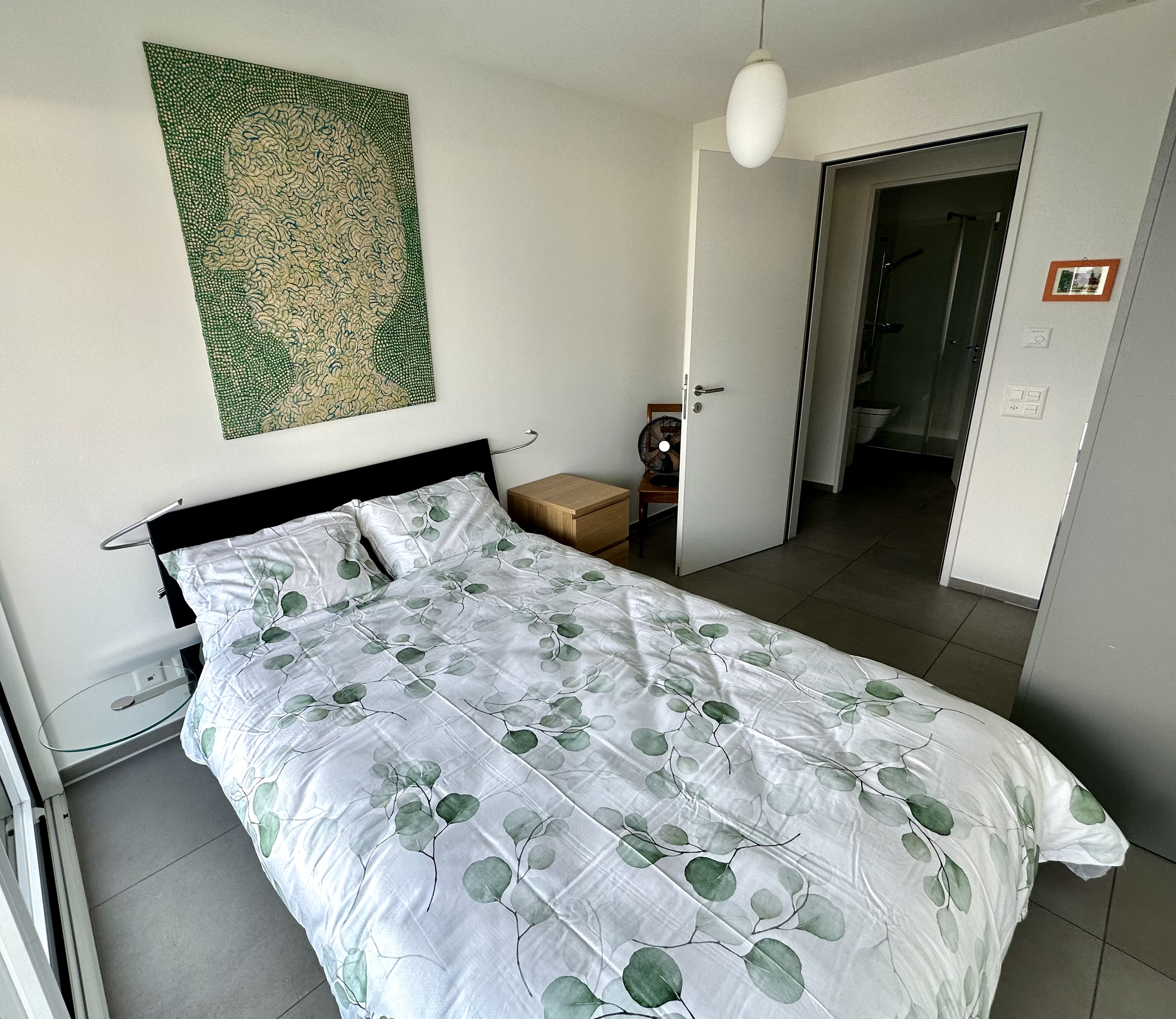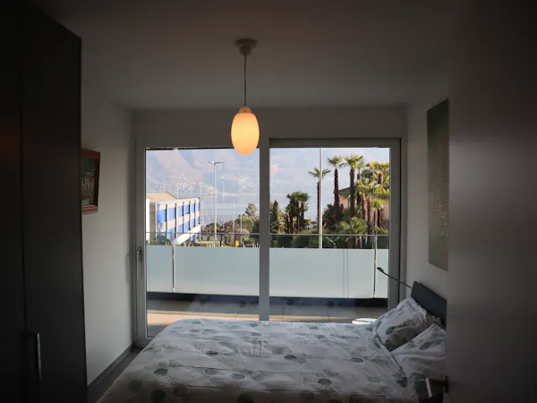 Dieses Schlafzimmer ist mit einem 140 × 200 cm Bett, Klimaanlage und ebenfalls schallisolierten Fenstern und Türen für maximalen Komfort ausgestattet. Aus dem Fenster geniessen Sie eine schöne Aussicht auf die Brissago-Inseln, und das Zimmer hat direkten Zugang zur Sitzgelegenheit im Garten – perfekt, um die frische Luft zu geniessen. Ein separates WC mit Waschbecken befindet sich bequem neben dem Zimmer.