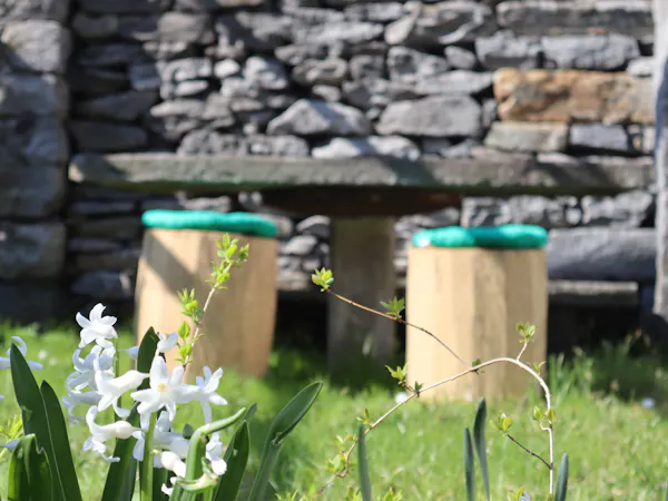 Die Wohnung befindet sich im Erdgeschoss. Den Haupteingang erreichst du bequem, wenn du durch das Tor neben dem Parkplatz gehst und den Garten überquerst. Dort erwartet dich ein privater Aussenbereich, in dem du auf Liegestühlen entspannen oder deine Mahlzeiten an einem traditionellen Tessiner Granittisch geniessen kannst. Zudem steht dir ein Abstellraum zur Verfügung, in dem du deine Fahrräder sicher unterbringen kannst – inklusive Lademöglichkeit.
