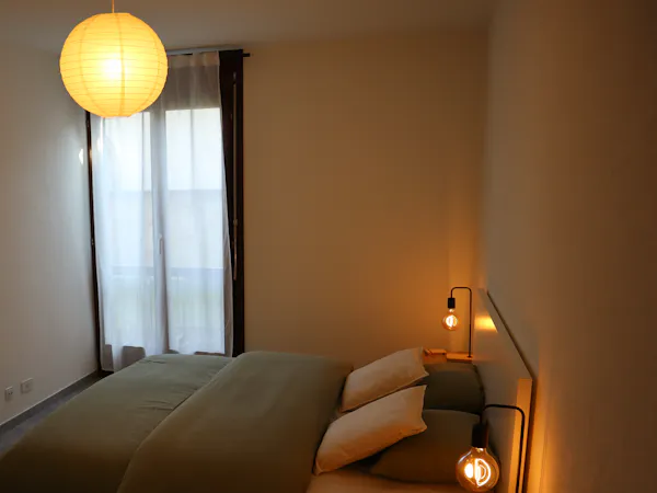 Beide Schlafzimmer haben ein Fenster mit Panoramasicht auf den See: Das erste Schlafzimmer verfügt über ein Doppelbett, bestehend aus zwei Einzelmatratzen (80 × 200 cm). Das zweite Schlafzimmer hat zwei Einzelbetten (je 80 × 200 cm).