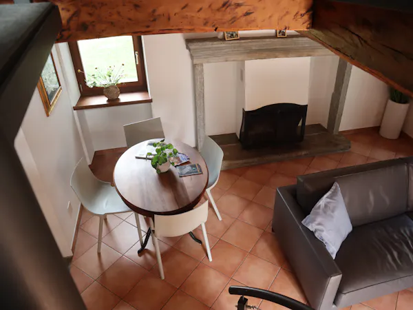 Das Studio ist hell und einladend, mit einer offenen Küche und einem Holzmezzanin mit Doppelbett (zwei Einzelmatratzen 90 × 200 cm). Auf Wunsch kann das Sofa im unteren Bereich als drittes Bett (90 × 200 cm) für einen zusätzlichen Gast vorbereitet werden.
