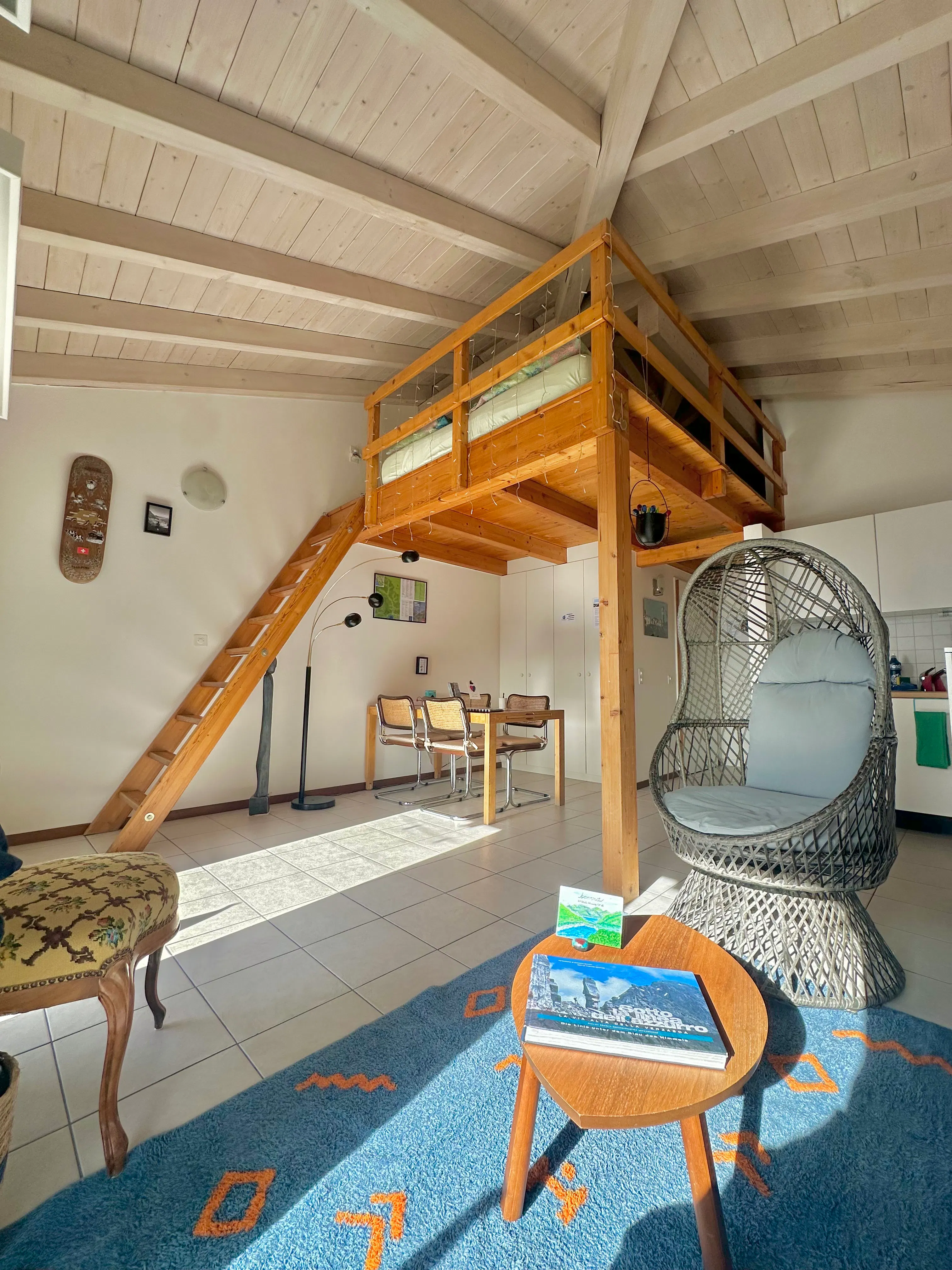 Das Studio ist hell und einladend, mit einer offenen Küche und einem Holzmezzanin mit Doppelbett (zwei Einzelmatratzen 90 × 200 cm). Auf Wunsch kann das Sofa im unteren Bereich als drittes Bett (90 × 200 cm) für einen zusätzlichen Gast vorbereitet werden.