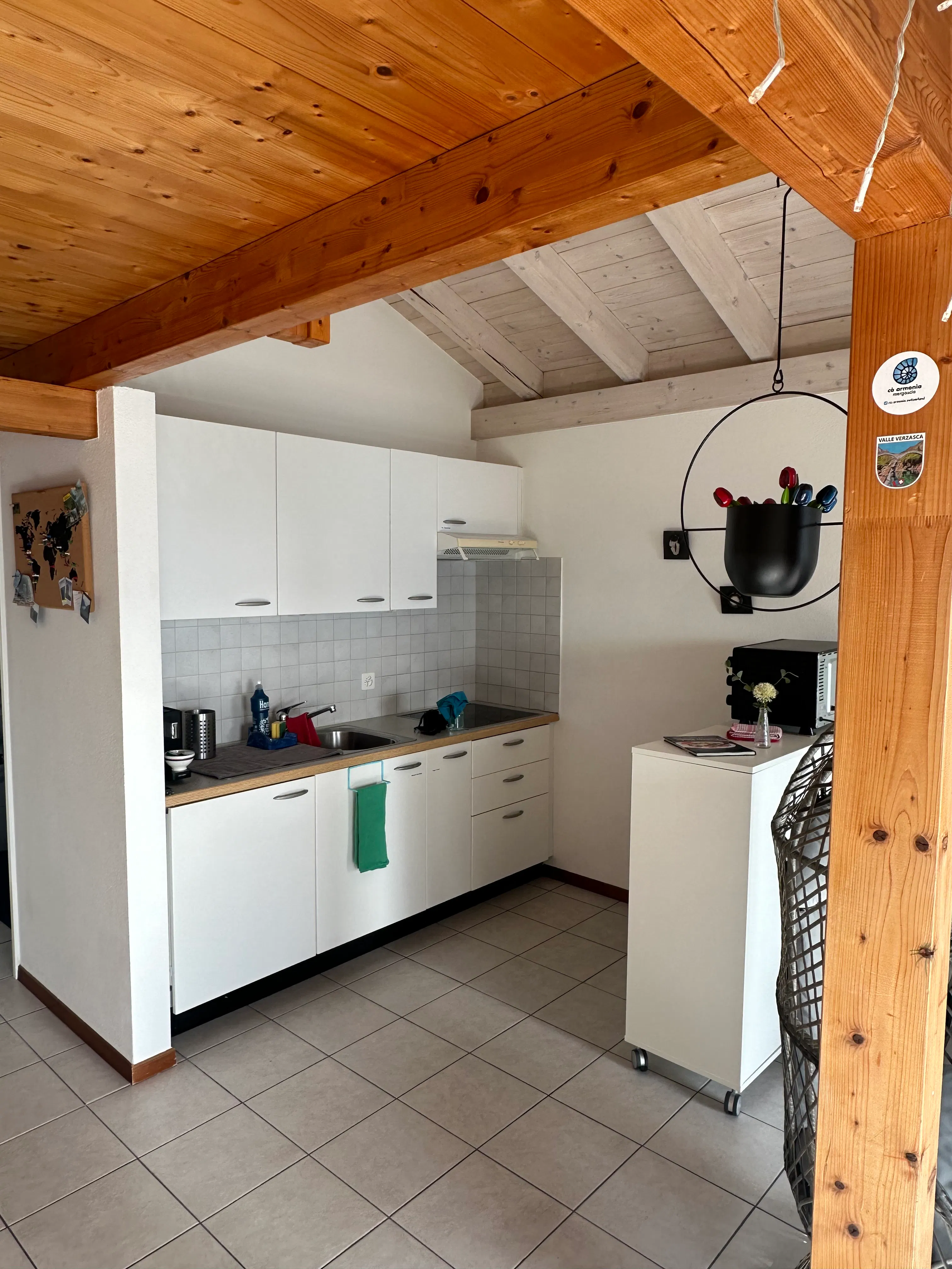 Die voll ausgestattete Küche enthält alles, was du für einen komfortablen Aufenthalt brauchst: Kühlschrank mit kleinem Gefrierfach, Elektroherd, kleiner Ofen, Toaster, Wasserkocher, Delizio-Kaffeemaschine (bitte eigene Kapseln mitbringen) und Bialetti Moka (bitte eigenen gemahlenen Kaffee mitbringen). Öl, Essig, Salz und Pfeffer sind vorhanden.