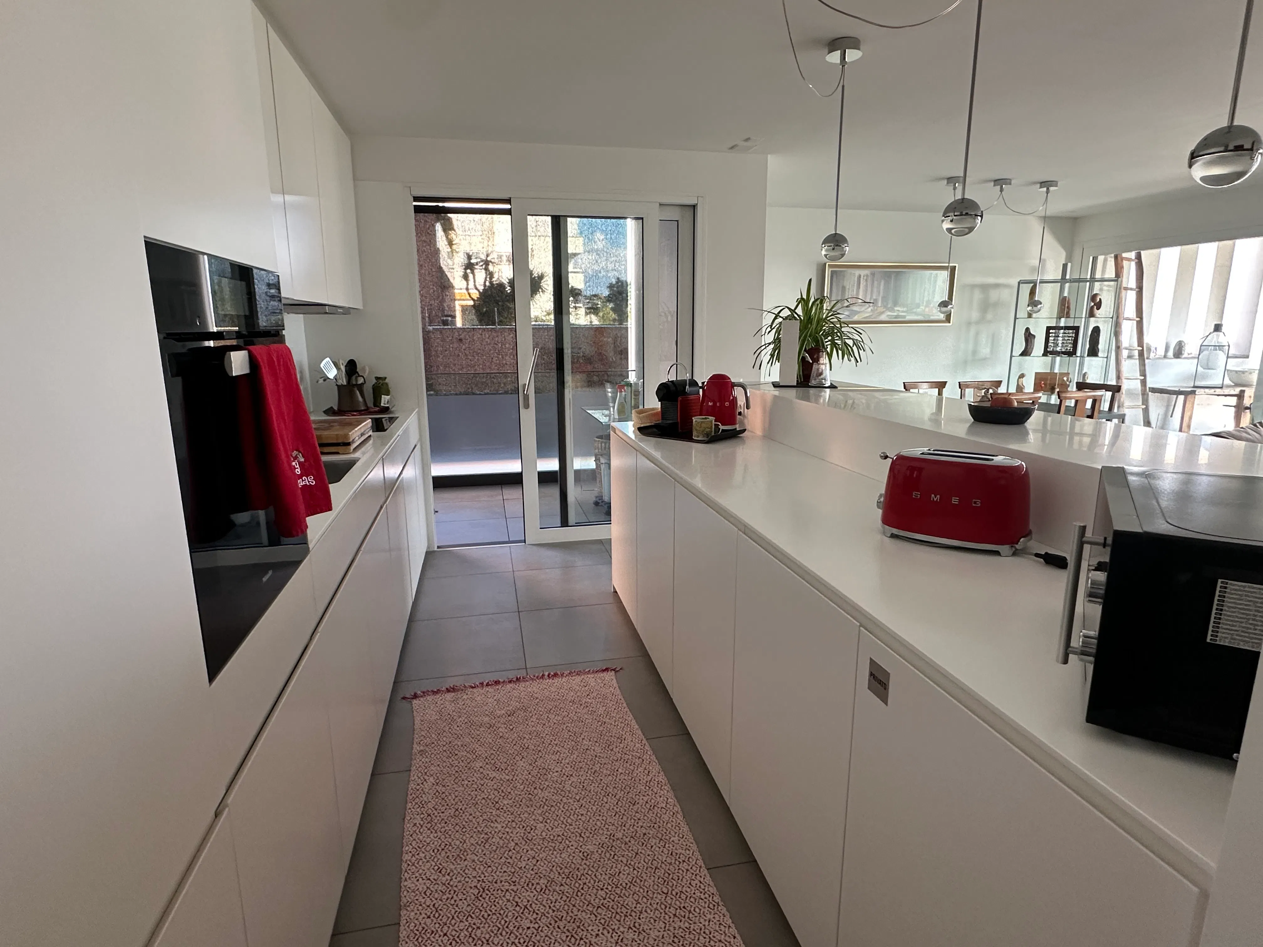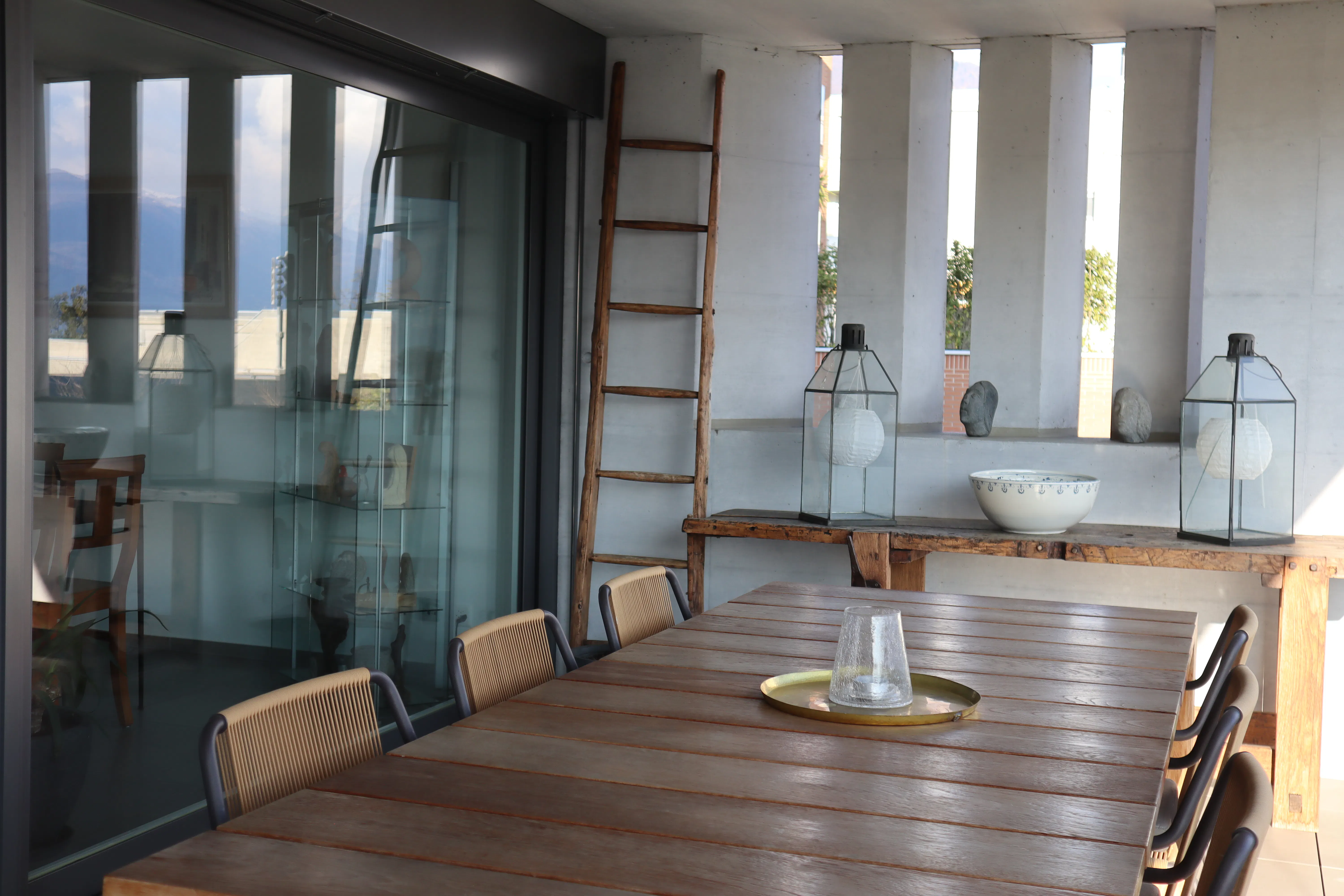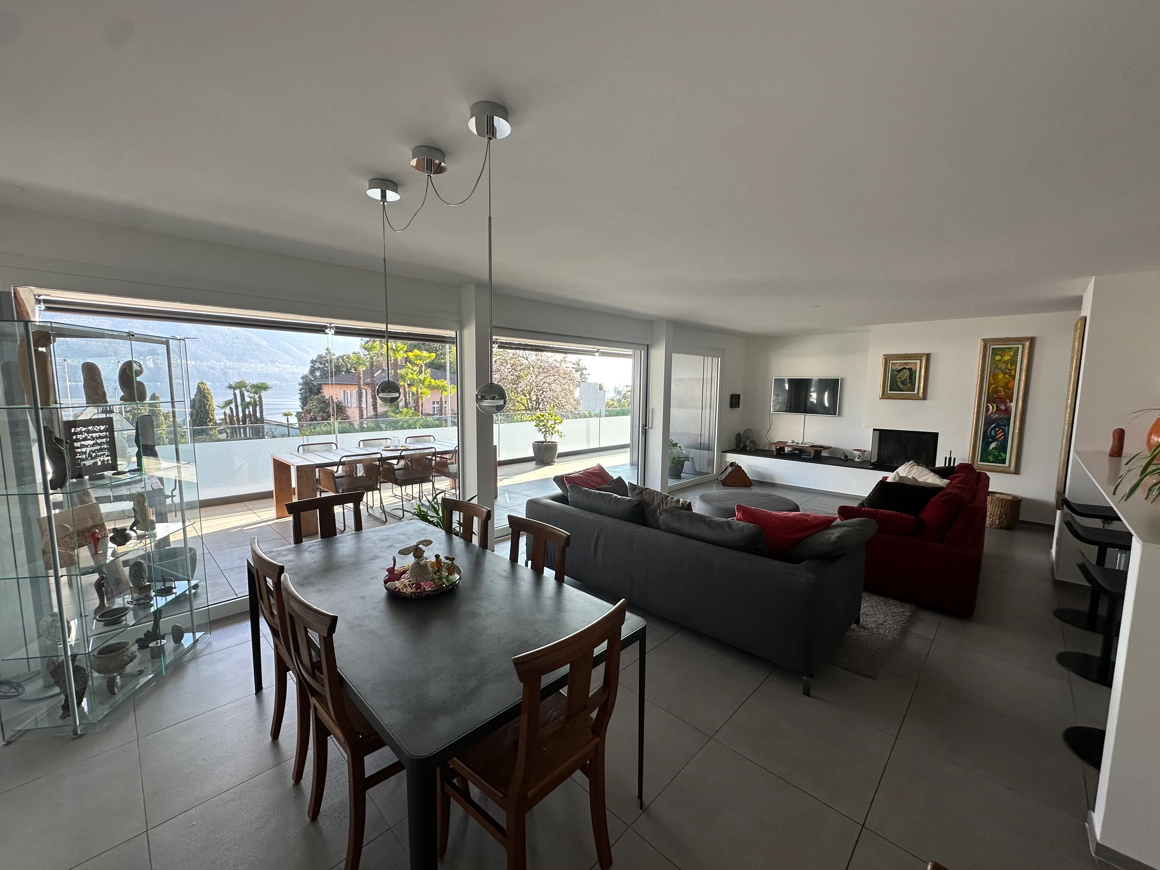 The large sliding glass doors in the living room lead to the terrace, furnished with a table and eight chairs perfect for outdoor lunches and dinners. Two bedrooms open directly onto the terrace, creating a harmonious connection between indoor and outdoor spaces.