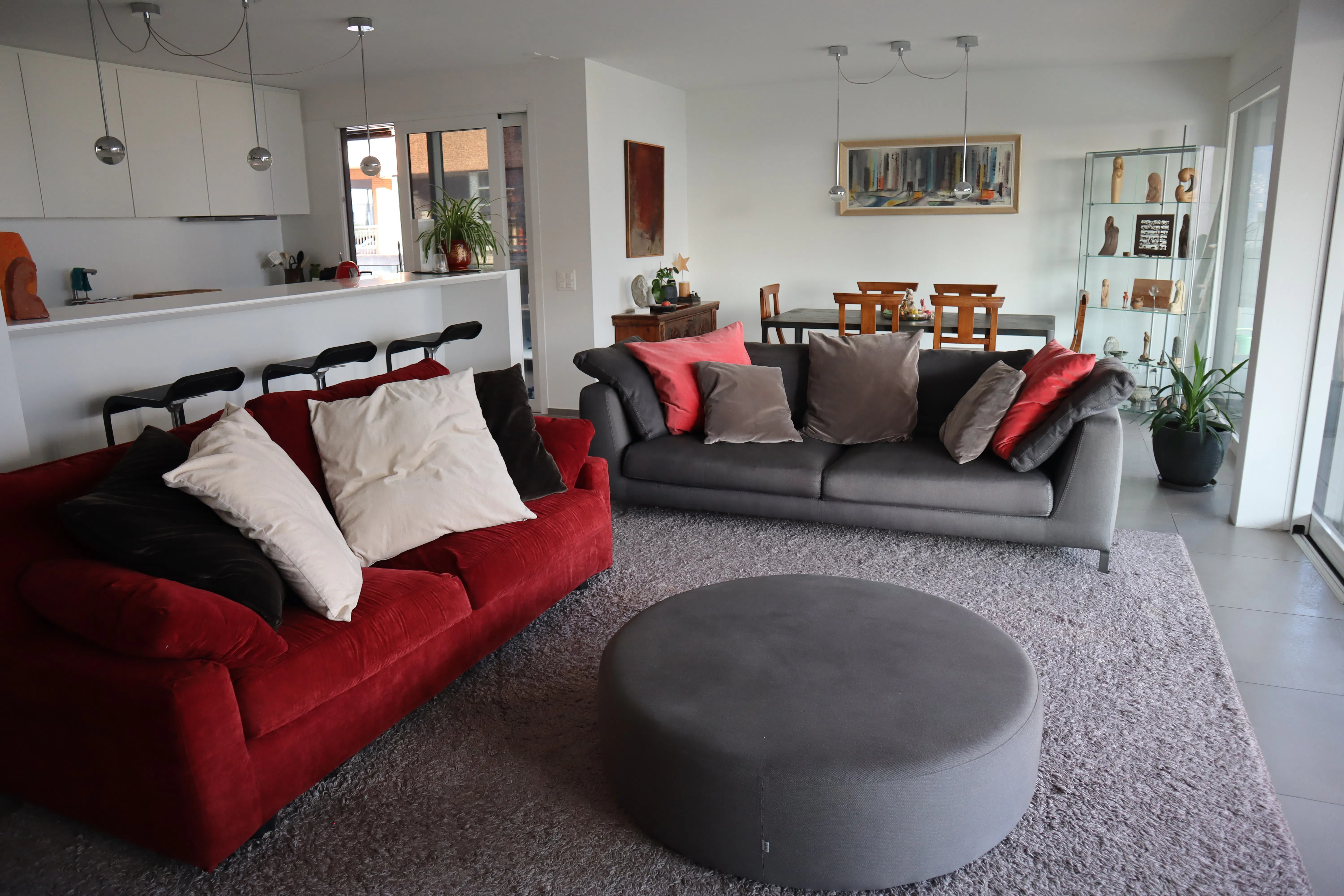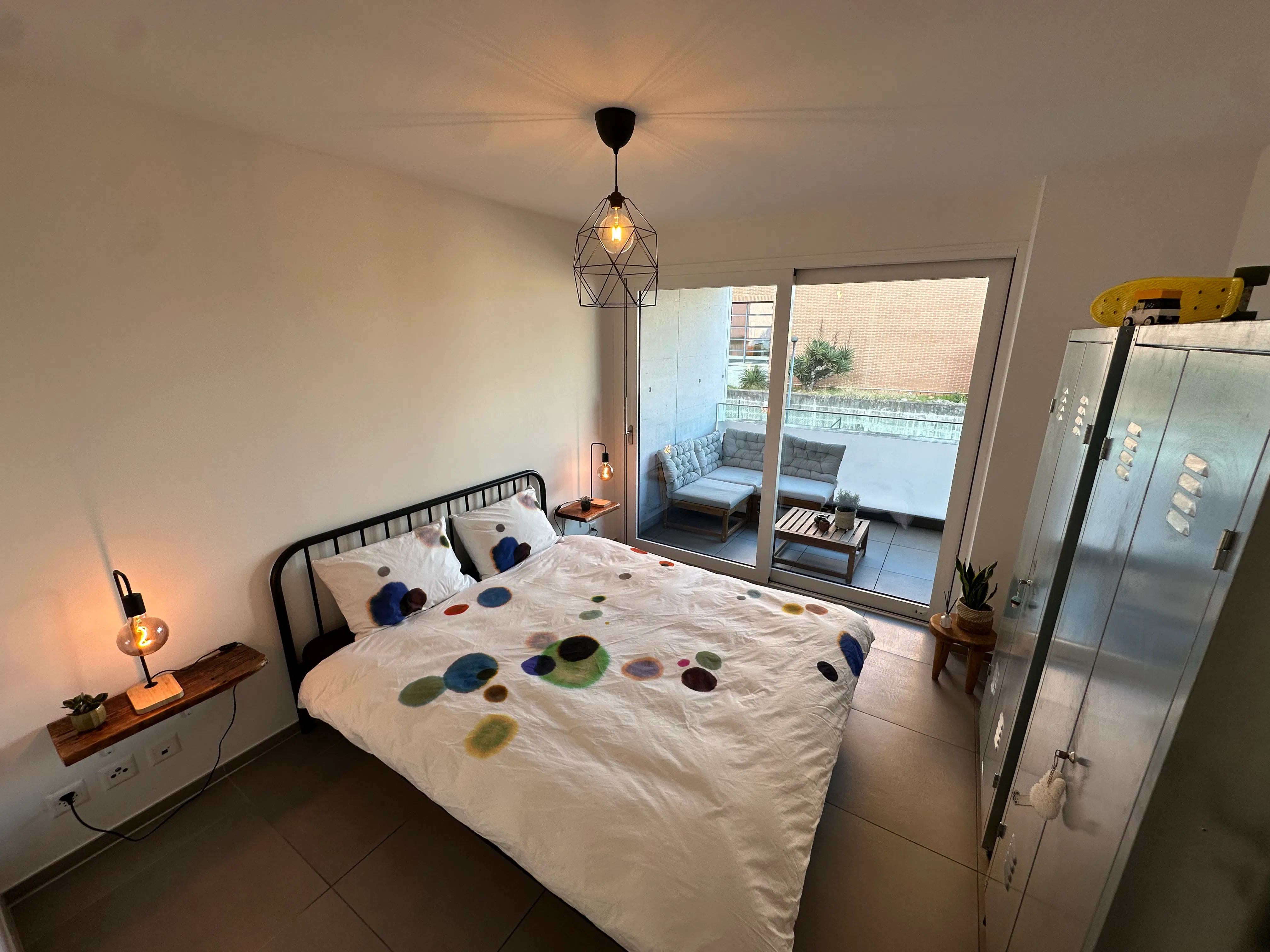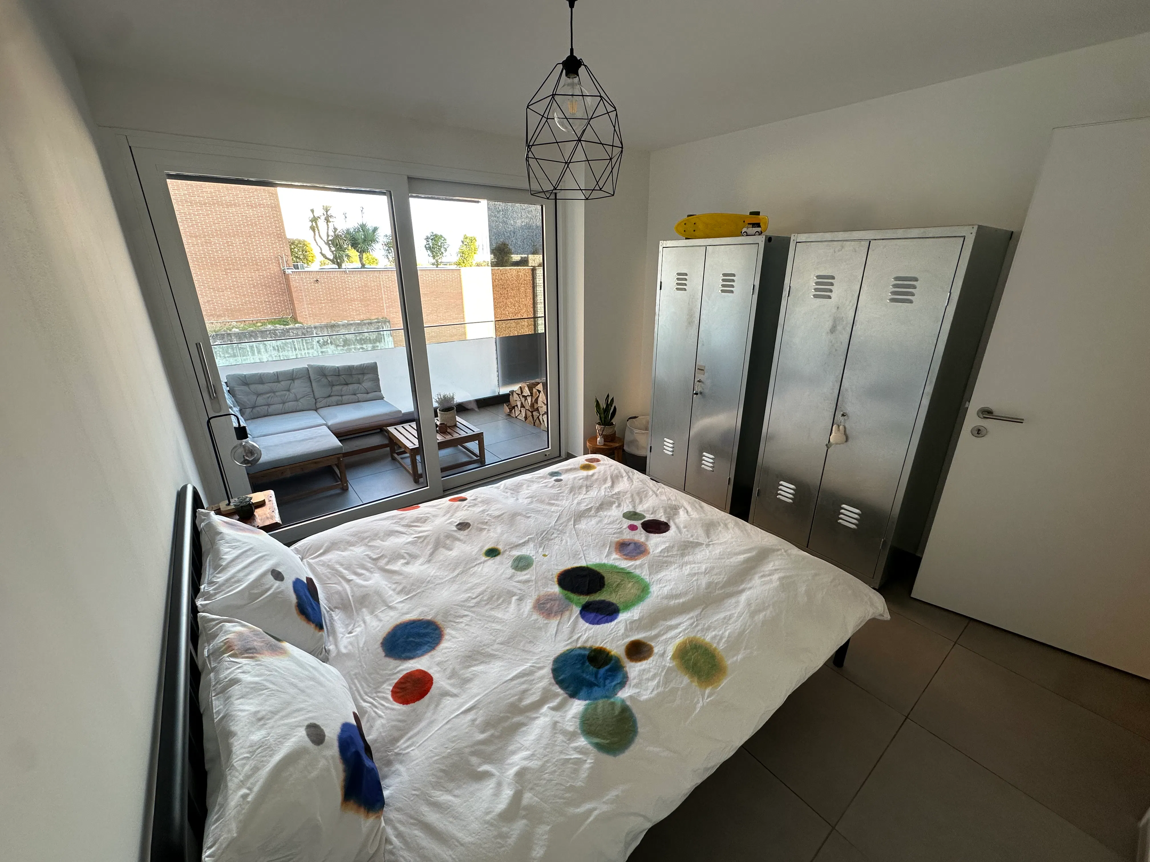 The large sliding glass doors in the living room lead to the terrace, furnished with a table and eight chairs perfect for outdoor lunches and dinners. Two bedrooms open directly onto the terrace, creating a harmonious connection between indoor and outdoor spaces.